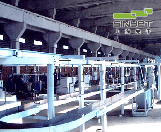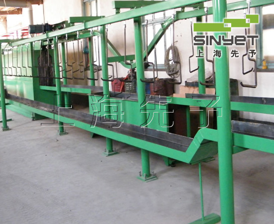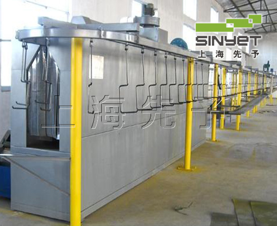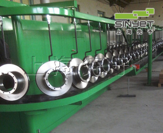 功能剎車盤高壓噴淋清洗機由傳輸裝置、高壓噴淋洗劑清洗段、噴淋漂洗段、吹干段、浸油段等組成一條連續(xù)生產(chǎn)線。操作者將工件放置在懸掛鏈上料段掛鉤上,輸送裝置將工件按程序依次送往高壓噴淋清洗段、噴淋漂洗段、吹干段和浸油段,對工件進(jìn)行噴淋清洗,然后清洗后的工件被送往噴淋漂洗段進(jìn)行噴淋漂洗,漂洗后的工件再被送往吹干段進(jìn)行吹干,干燥后浸防銹油、最后送到下料工位卸下,整個清洗即完成。由于整臺設(shè)備為全自動設(shè)備,節(jié)省了人力,降低了操作者的勞動強度,提高了工作效率。